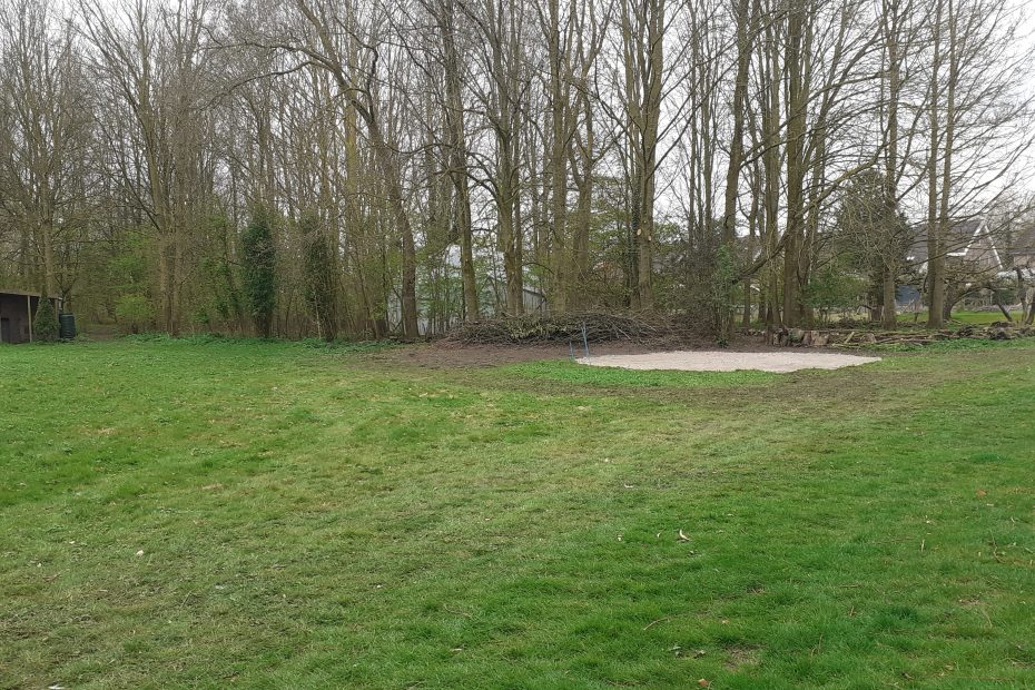 Op de foto (9 april 2026) zie je rechts de toren van de melkfabriek ‘De Volharding’. In het midden het Tuintheater en links de Krielenschuur. De krielen woonden daar totdat ze op sinterklaasavond 2009 cadeautjes werden voor de kindertjes van medebewoners, de vossenwelpjes. De naam bleef. Het werd een zitje en een schuur. Het grasveld is wat kaal geworden omdat ik de schapen niet heb kunnen leren waarvan ze wel en niet mochten eten. De nog levende struiken heb ik verplaatst. Anderen hebben een gazen bescherming gekregen. Tot 17 mei of een andere dag ! ?